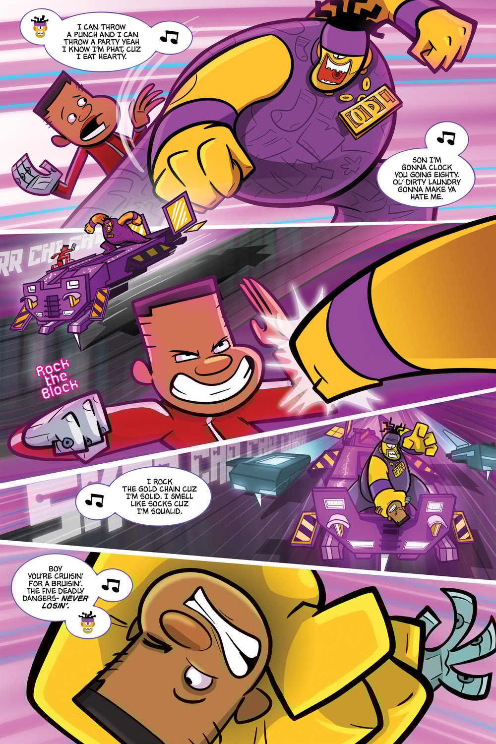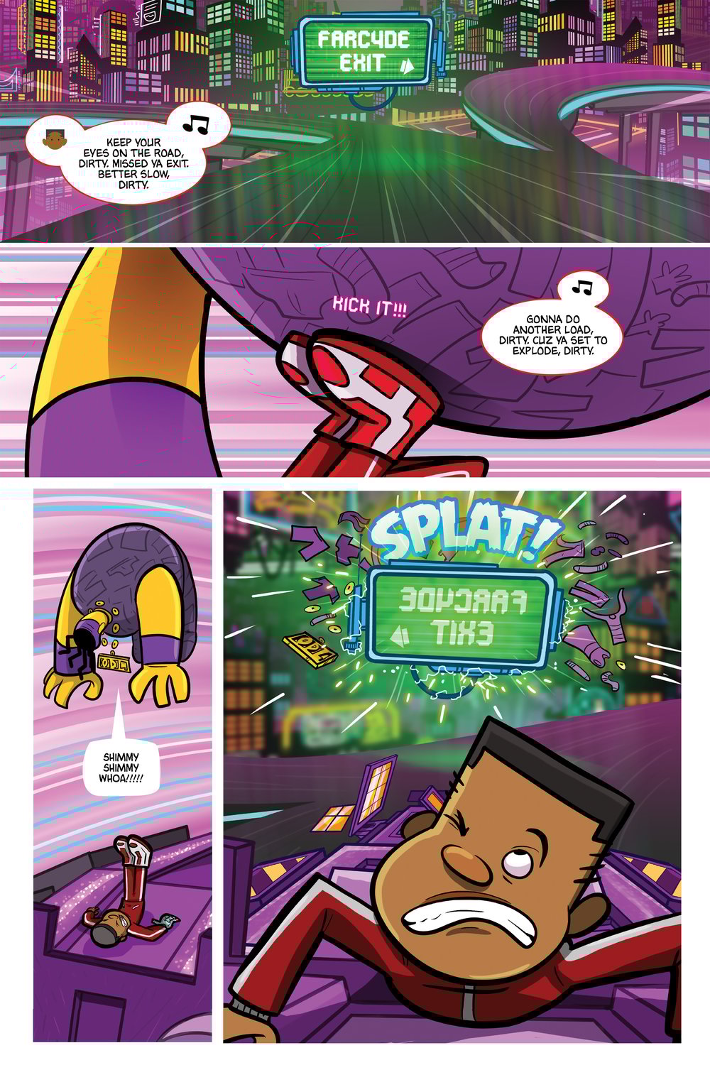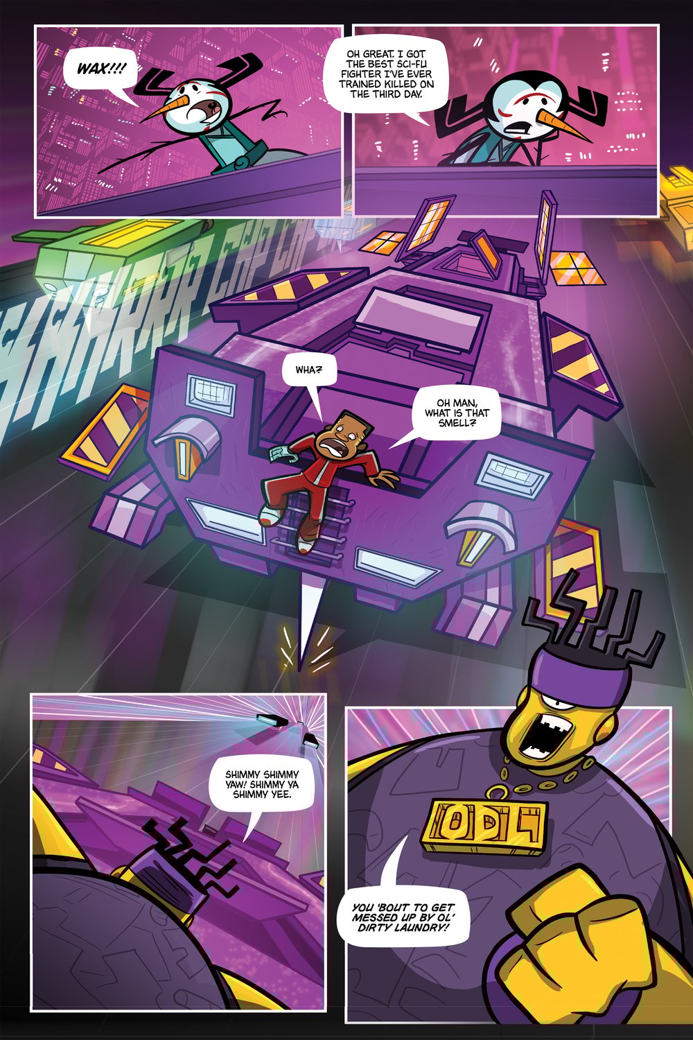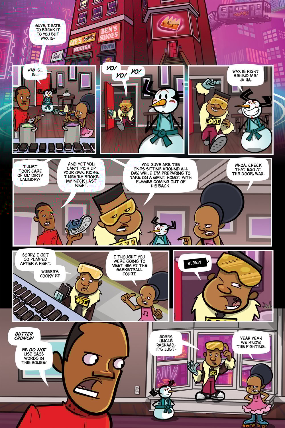 Hip-hop, sci-fi and kung fu all hit the turntables for the mash-up mix of the year! Cartoonist/force of nature Yehudi Mercado (Pantalones, TX, Rocket Salvage) sets his sights on 1980s Brooklyn and Wax, a young mix-master who scratches the perfect beat and accidentally summons a UFO that transports his family, best friend, and current crush to the robot-dominated planet of Discopia. Now Wax and his crew must master the intergalactic musical martial art of Sci-Fu to fight the power and save Earth. Word to your mother.